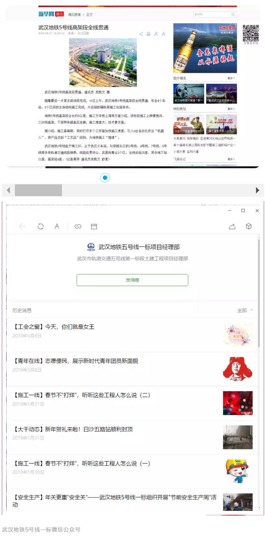 武漢地鐵5號線一標(biāo)項目黨支部成立了由項目書記為組長的宣傳工作領(lǐng)導(dǎo)小組,組織制定了項目宣傳工作年度計劃及獎懲辦法。在《中鐵上海工程》報投稿工作方面,每月制定宣傳工作總結(jié)和下月工作計劃,截至目前已在《中鐵上海工程》報上刊稿6篇。在對外宣傳工作方面,在重大節(jié)點、人才培養(yǎng)、企業(yè)文化等方面深入挖掘,此外,黨支部還創(chuàng)辦了“武漢地鐵五號線一標(biāo)項目經(jīng)理部”微信公眾訂閱號,每日上傳施工日報,并結(jié)合施工生產(chǎn)、黨建工作及企業(yè)文化等方面情況,開辟了大干動態(tài)、黨群園地、信息速遞等欄目,第一時間推送微信信息,將微信公眾號打造成了展示項目文化的“窗口”。